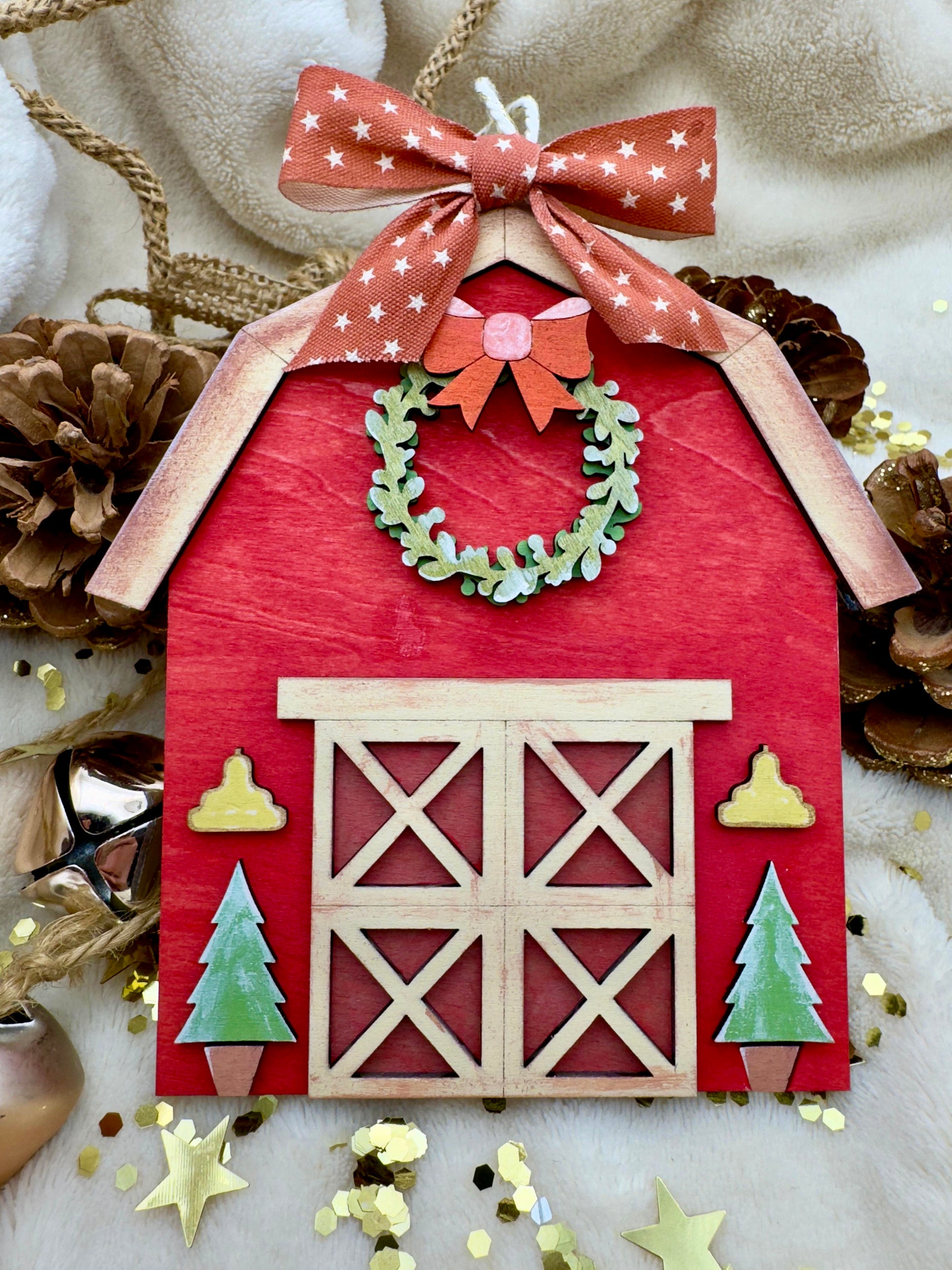 Ispirata alle calde atmosfere delle feste in campagna, questa cascina natalizia in legno è interamente realizzata e dipinta a mano. Il rosso intenso richiama i tradizionali fienili americani, mentre la ghirlanda verde, le campanelle dorate e i piccoli abeti aggiungono quel tocco rustico e autentico che profuma di casa e di Natale vero.