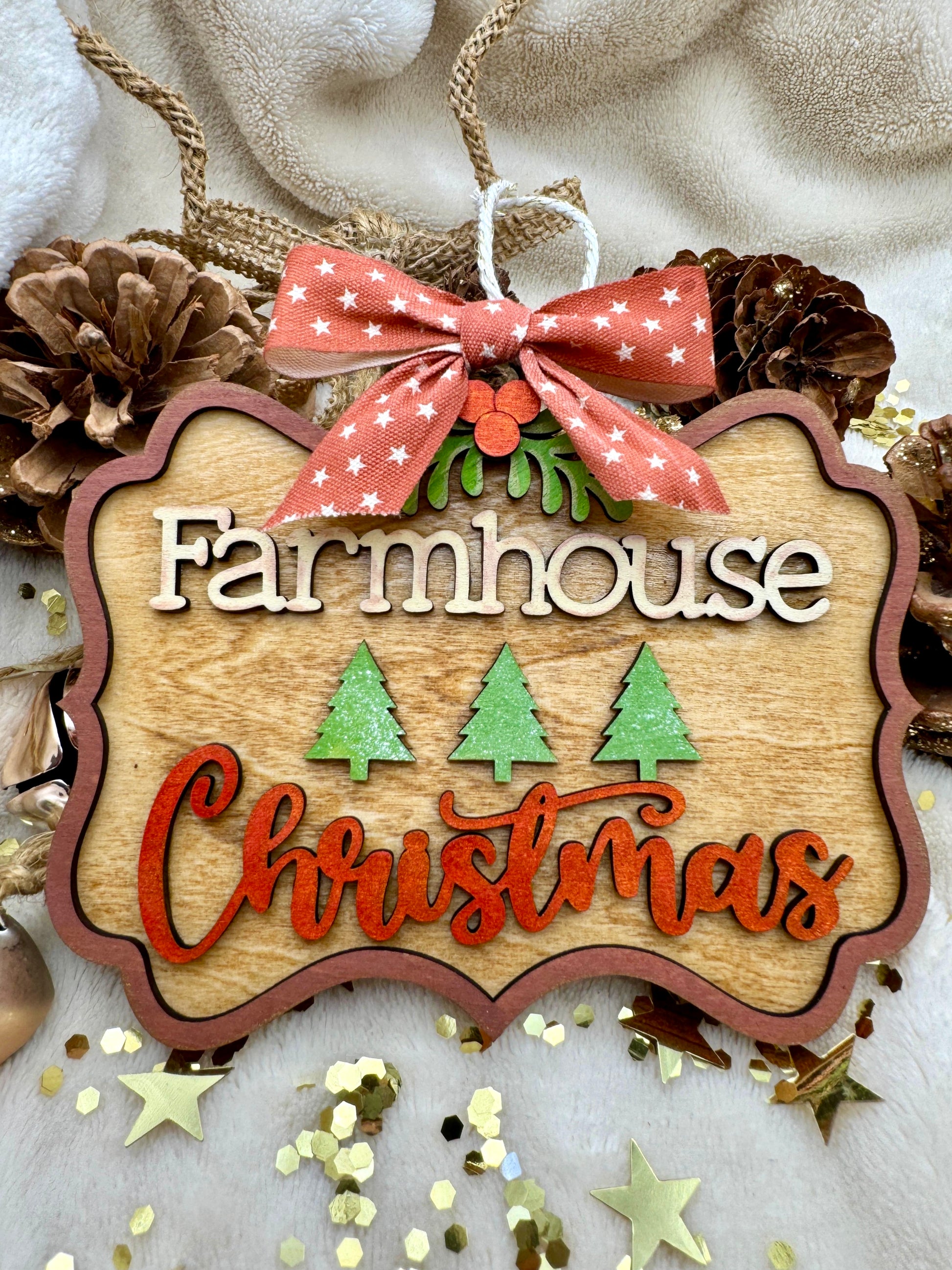 Il fiocco in tessuto aggiunge un tocco di dolcezza e tradizione, mentre la forma sagomata e i dettagli curati rendono ogni pezzo unico e pieno di carattere. Perfetta da appendere all’albero, su una ghirlanda o come decorazione murale, porta in casa il profumo del legno e la magia semplice delle feste in stile country.
