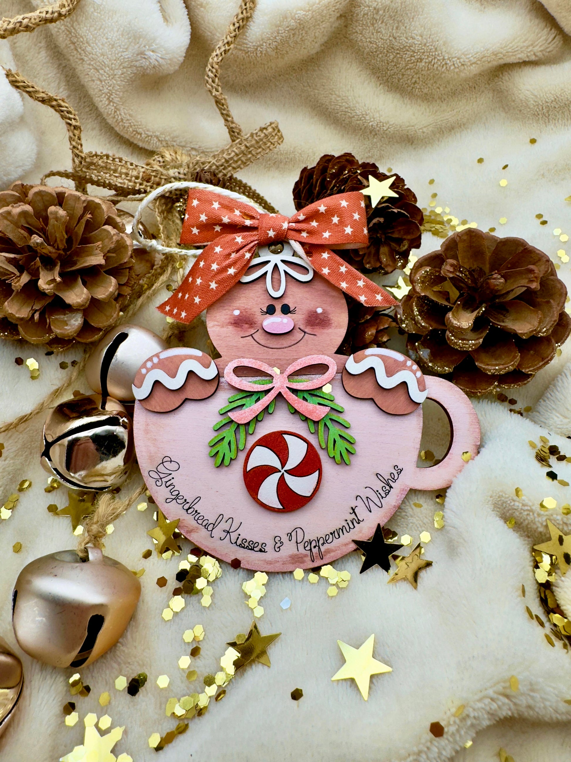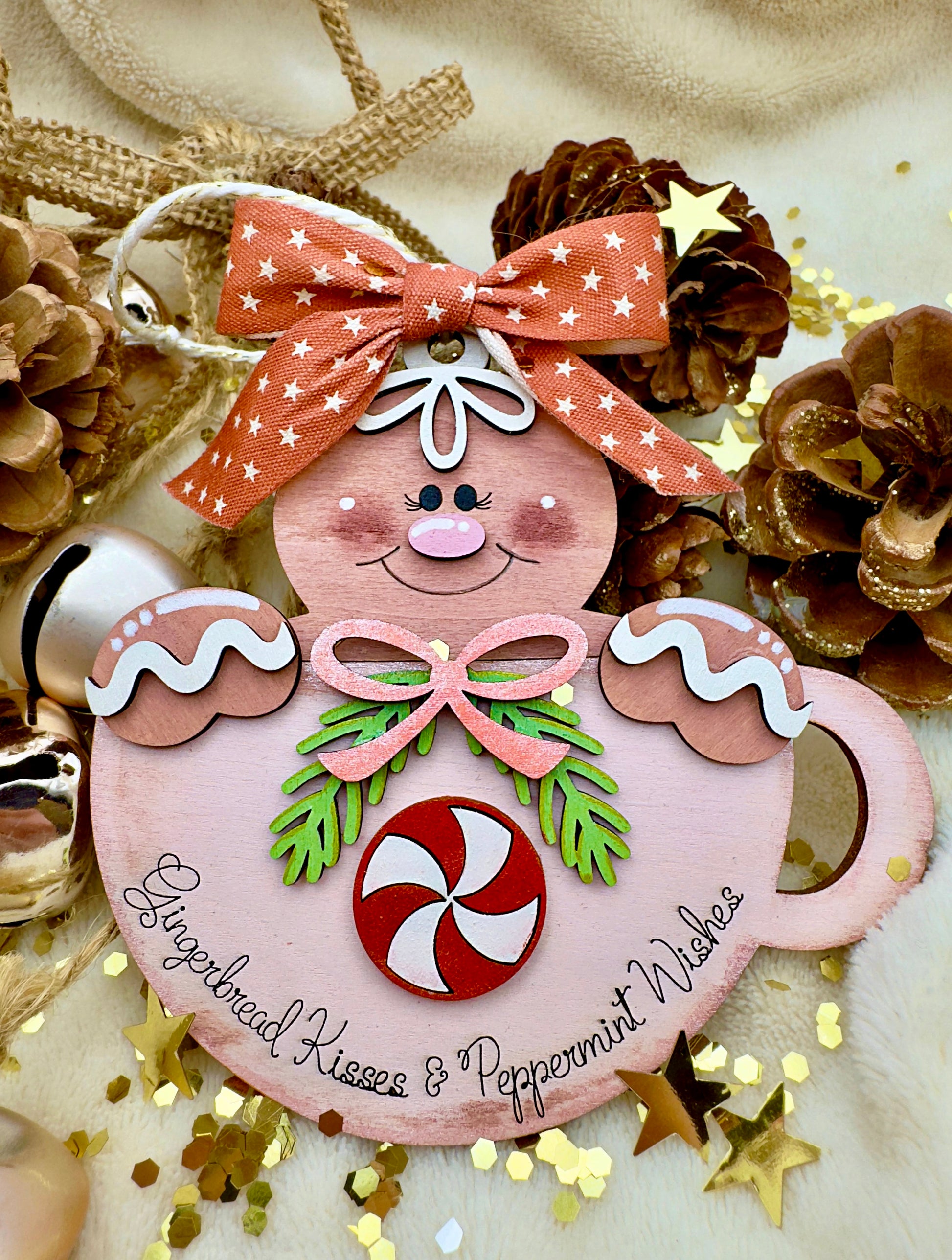 Dolce e irresistibile come il profumo del Natale, questo tenerissimo ornamento in legno raffigura un simpatico omino di pan di zenzero che spunta da una tazza decorata con dettagli curati a mano. Il fiocco rosso con stelline, la caramella al centro e la scritta “Gingerbread Kisses & Peppermint Wishes” rendono questa creazione un piccolo capolavoro artigianale.