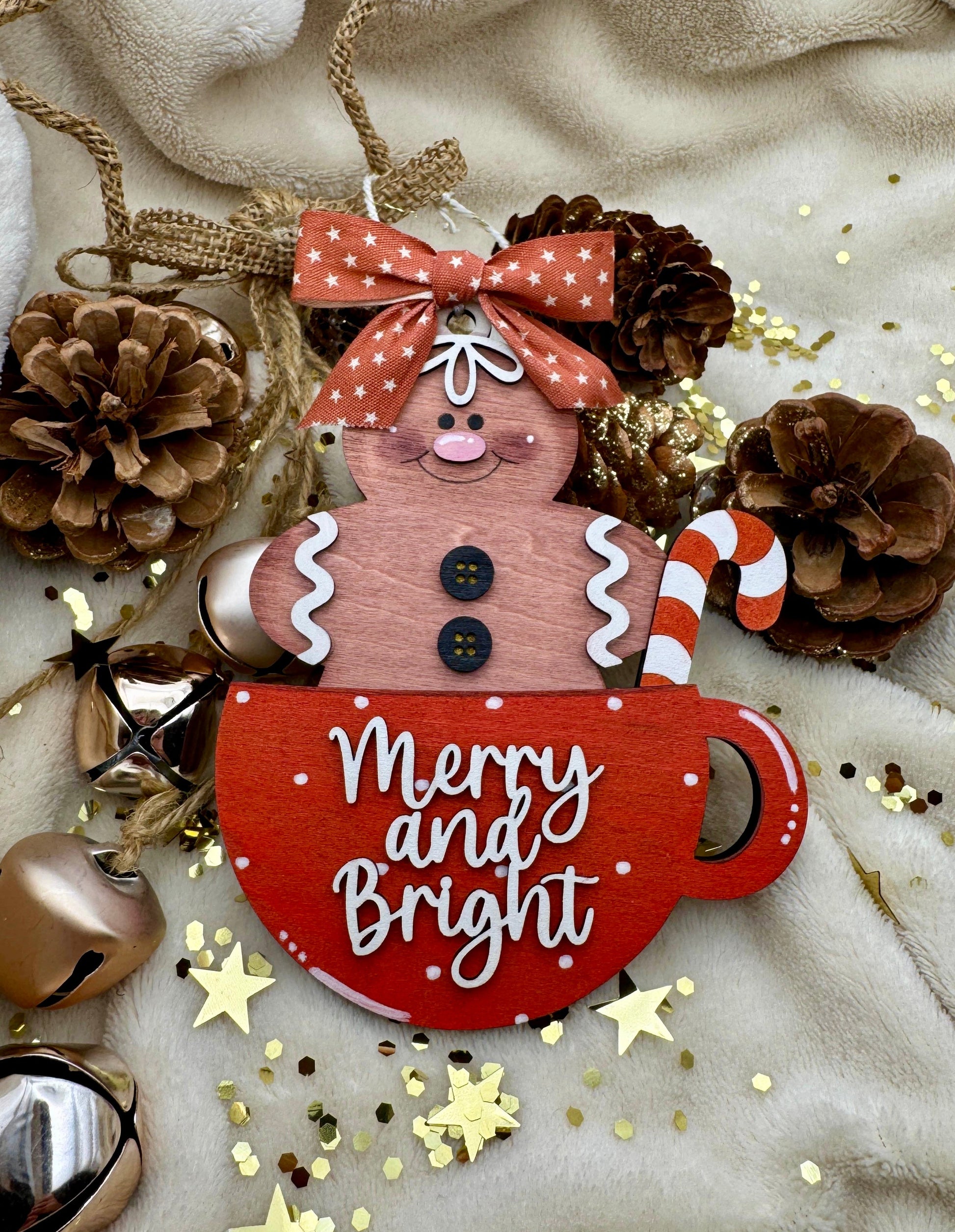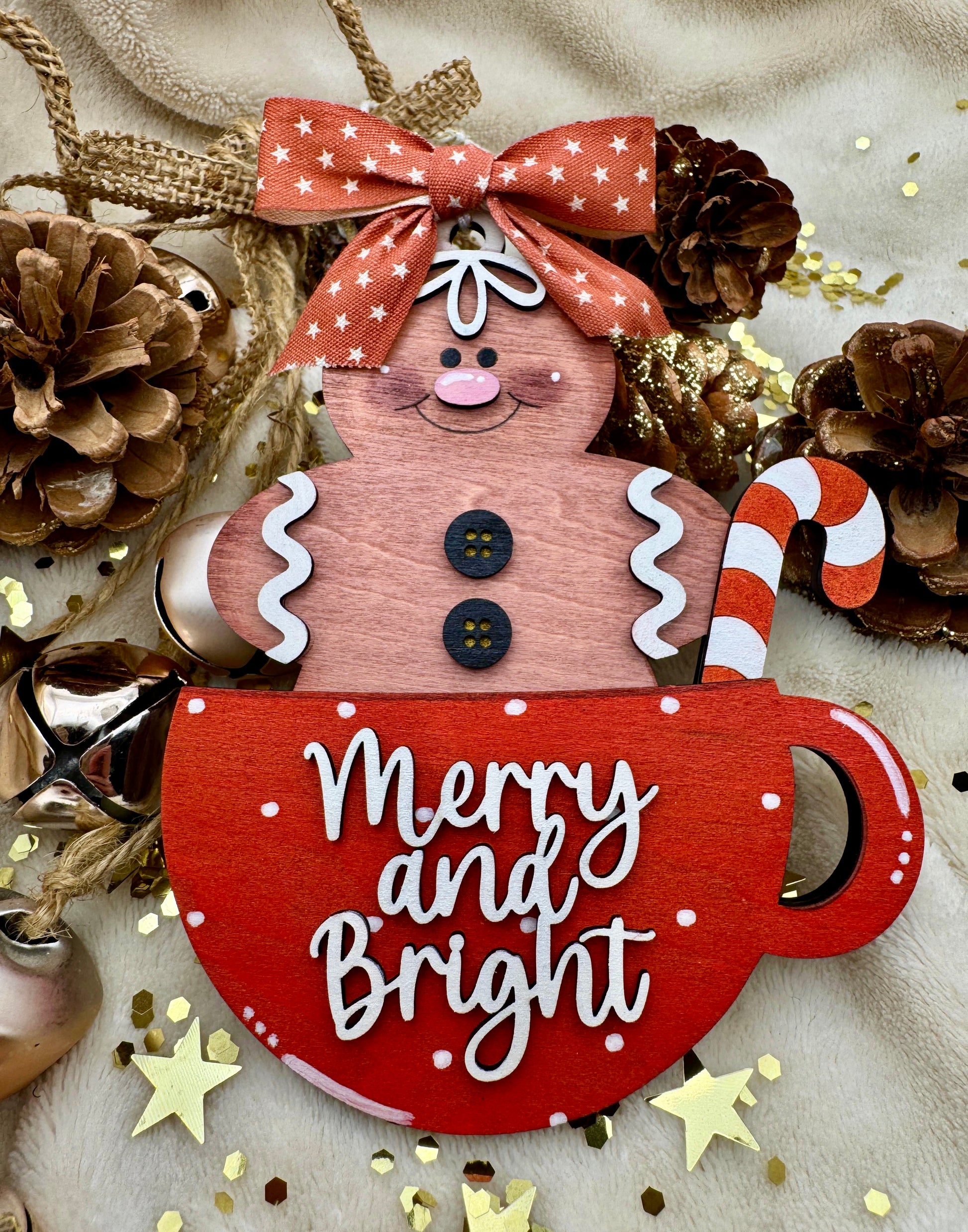 Questo grazioso ornamento in legno raffigura un simpatico omino di pan di zenzero che spunta da una tazza rossa con la scritta “Merry and Bright”. Il tutto è impreziosito da un fiocco in tessuto rosso con stelline bianche, una deliziosa caramella a righe e dettagli dipinti a mano che donano un tocco autentico e artigianale.
