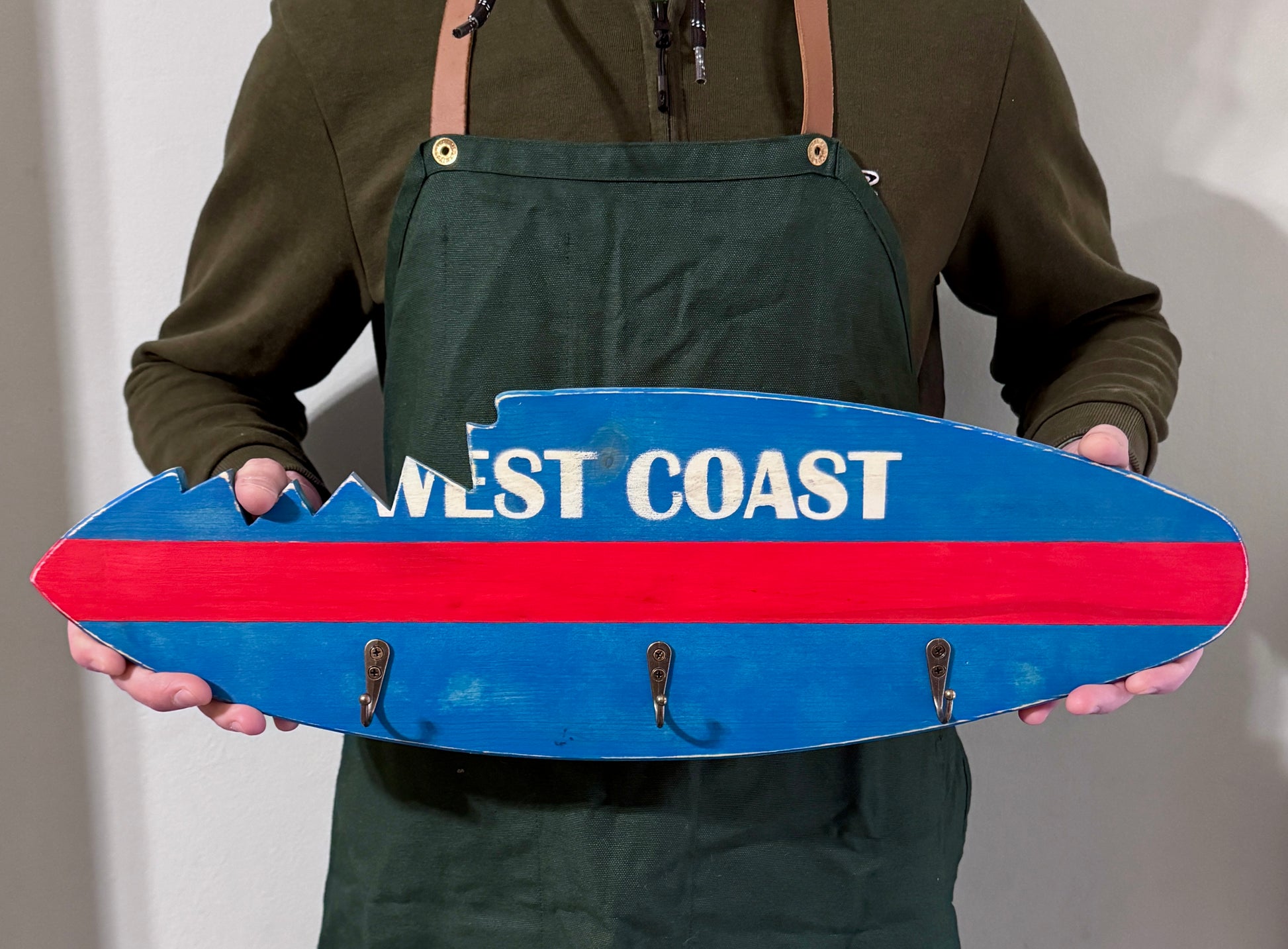 Un appendiabiti in legno unico, a forma di tavola da surf, con scritta “WEST COAST” e dettaglio del morso di squalo, che richiama subito lo stile iconico delle spiagge californiane.