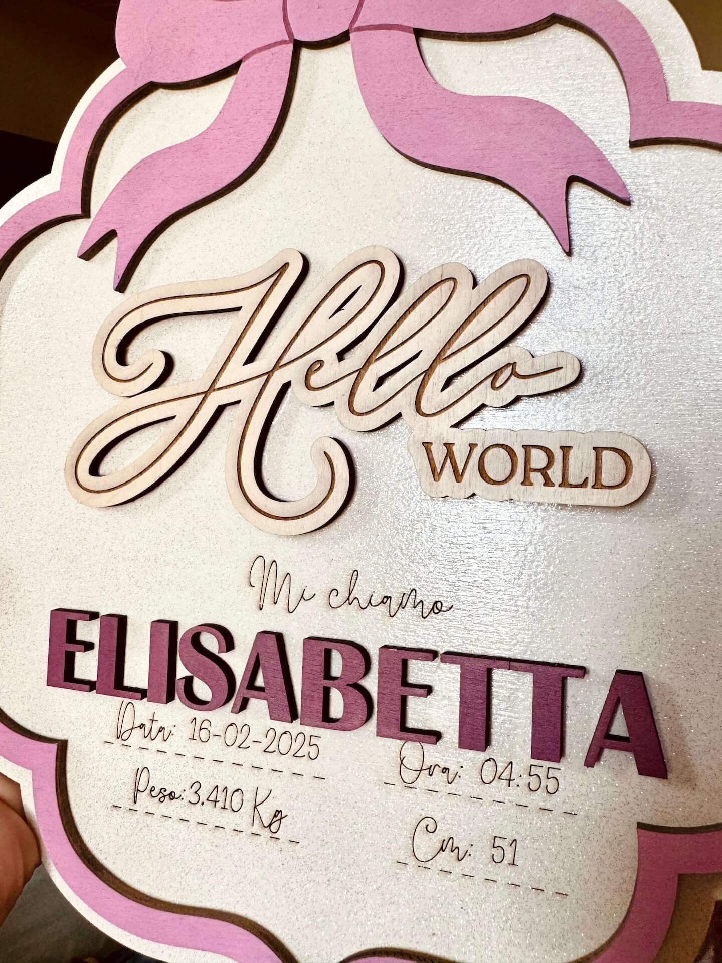 Il design elegante con la scritta Hello World e il fiocco rosa donano un tocco shabby unico e delicato.