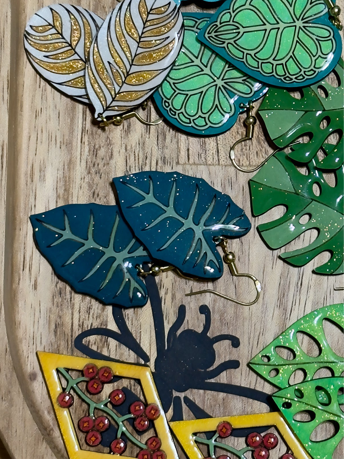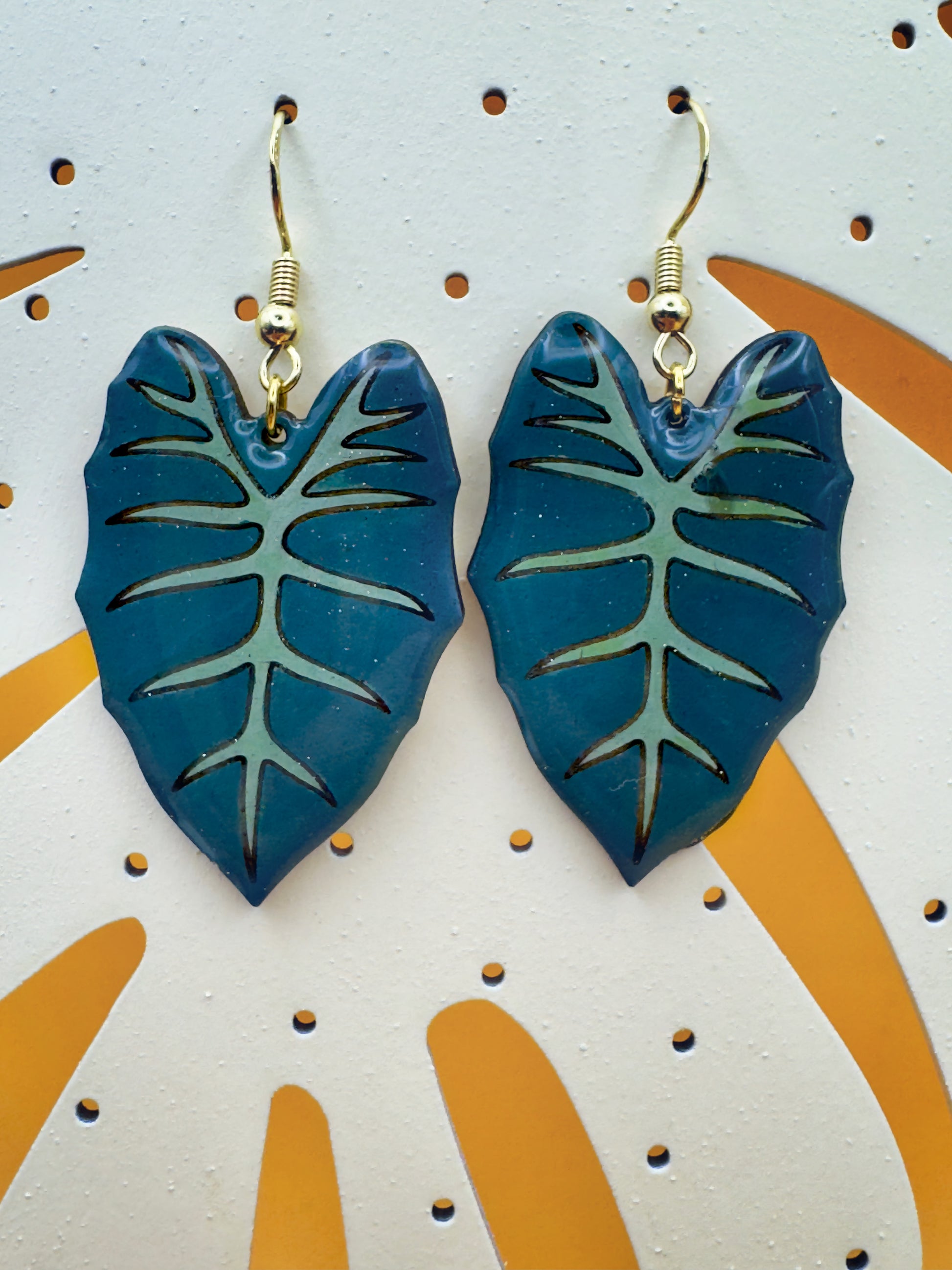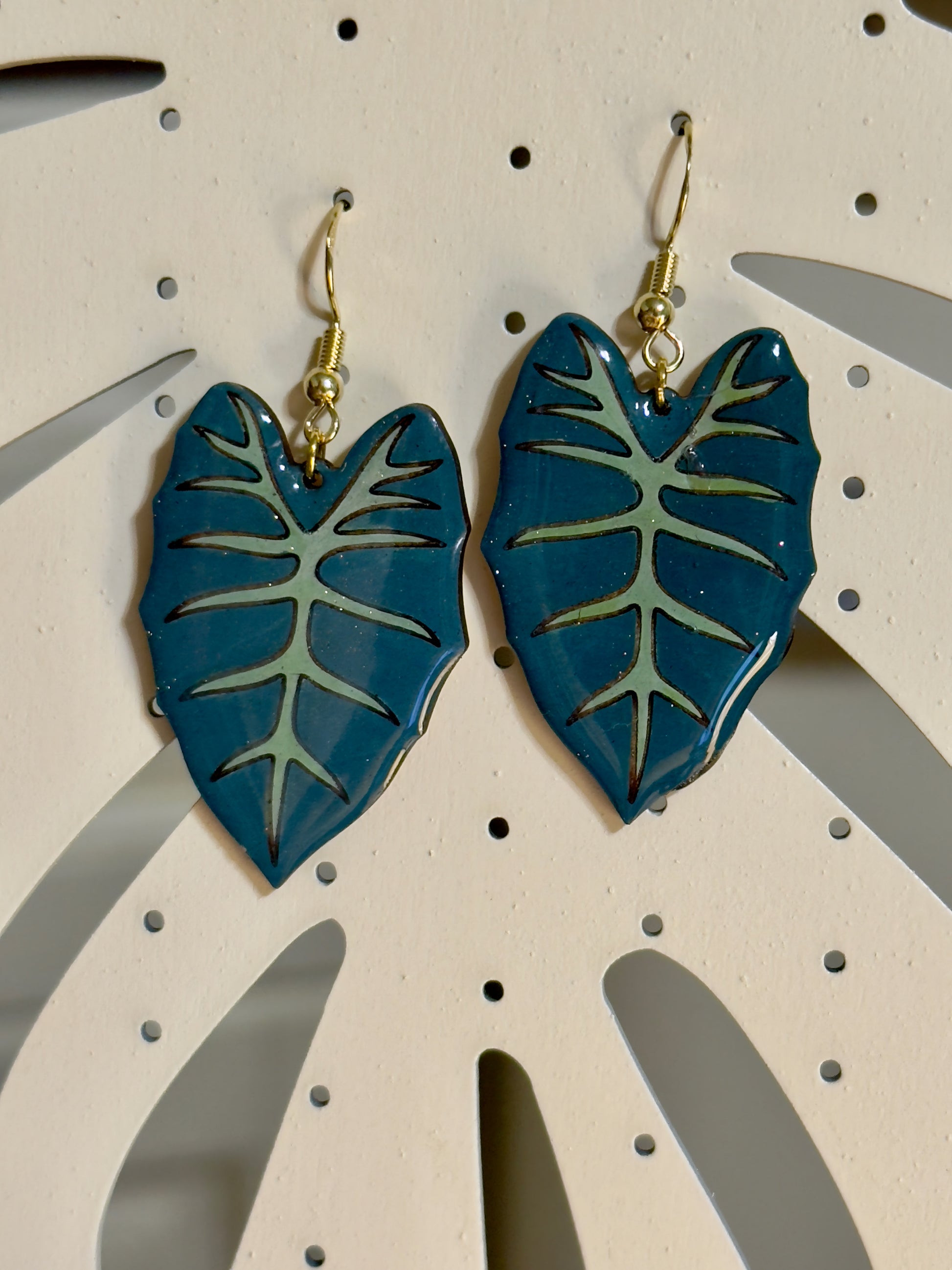 Un accessorio leggero e naturale che porta con sé i colori e la vitalità della giungla. Realizzati a mano in legno inciso a laser, questi orecchini a forma di foglia presentano una raffinata finitura blu-verde con venature stilizzate che donano profondità e carattere.