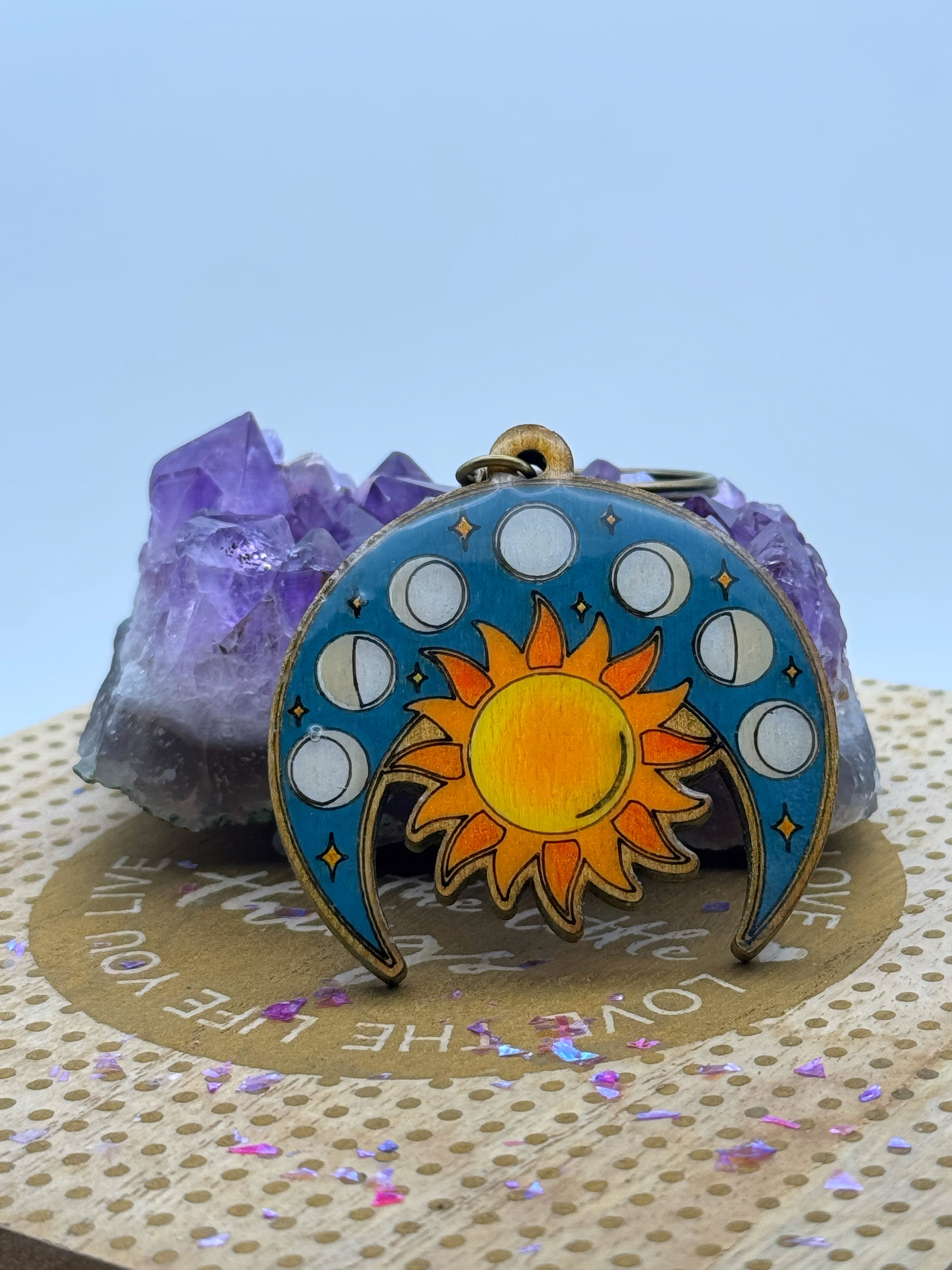 Un accessorio unico che racchiude la magia del cielo. Realizzato in legno tagliato e inciso a laser, questo portachiavi raffigura il Sole centrale avvolto da una mezzaluna azzurra con tutte le fasi lunari e piccoli dettagli stellati.