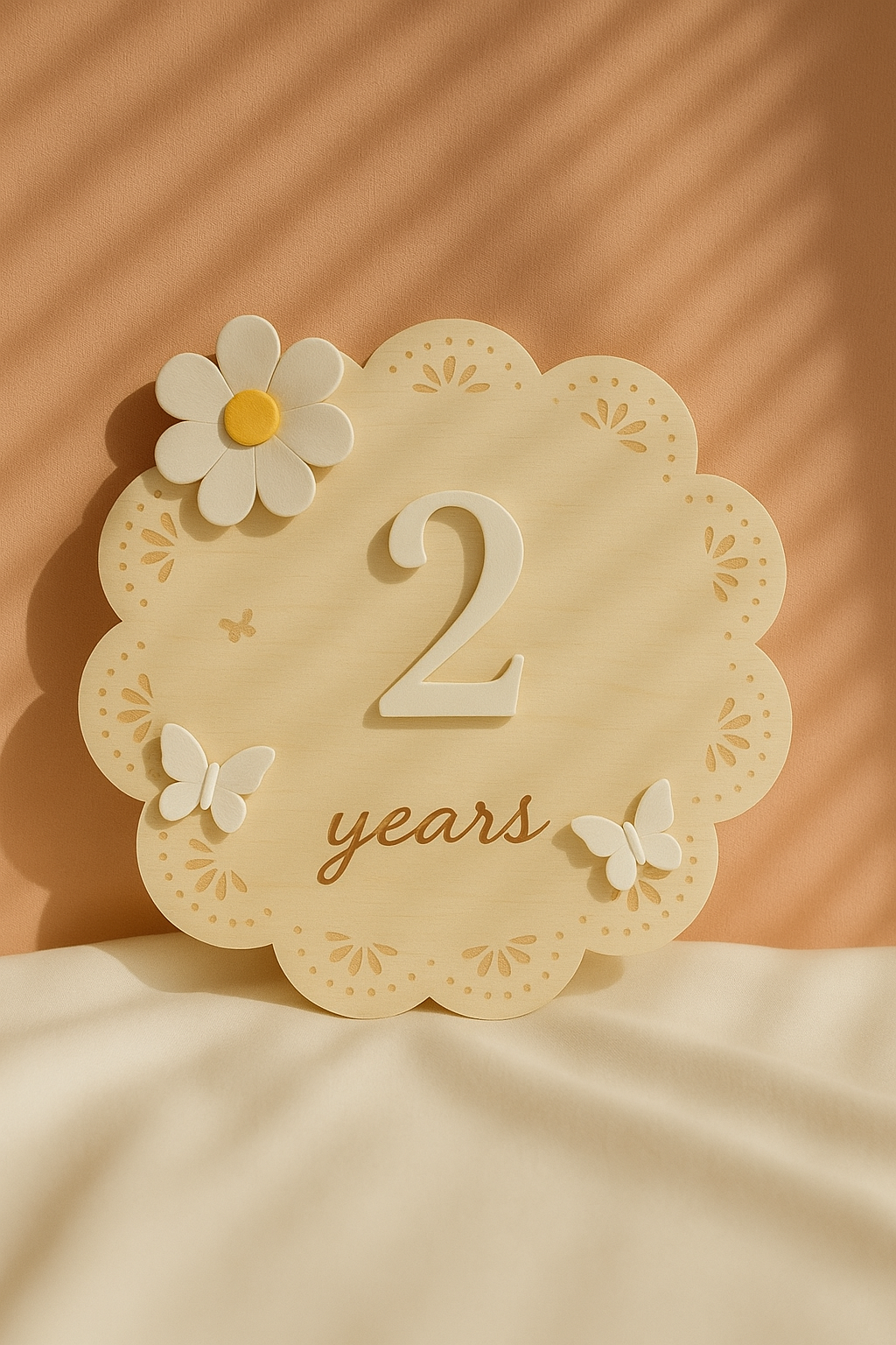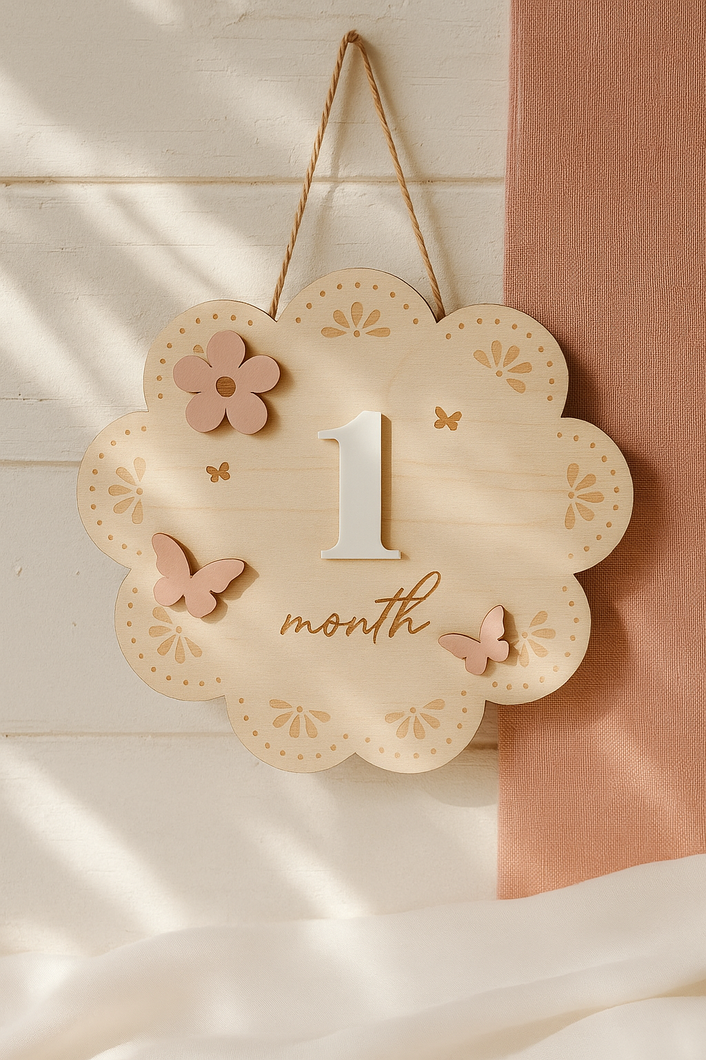 Una dolcissima targa in legno, perfetta per accompagnare la crescita della tua bimba con foto ricordo uniche e indimenticabili. La forma a fiorellino, impreziosita da delicati dettagli incisi, si arricchisce di una margherita applicata e piccole farfalline che donano un tocco di serenità e dolcezza.
