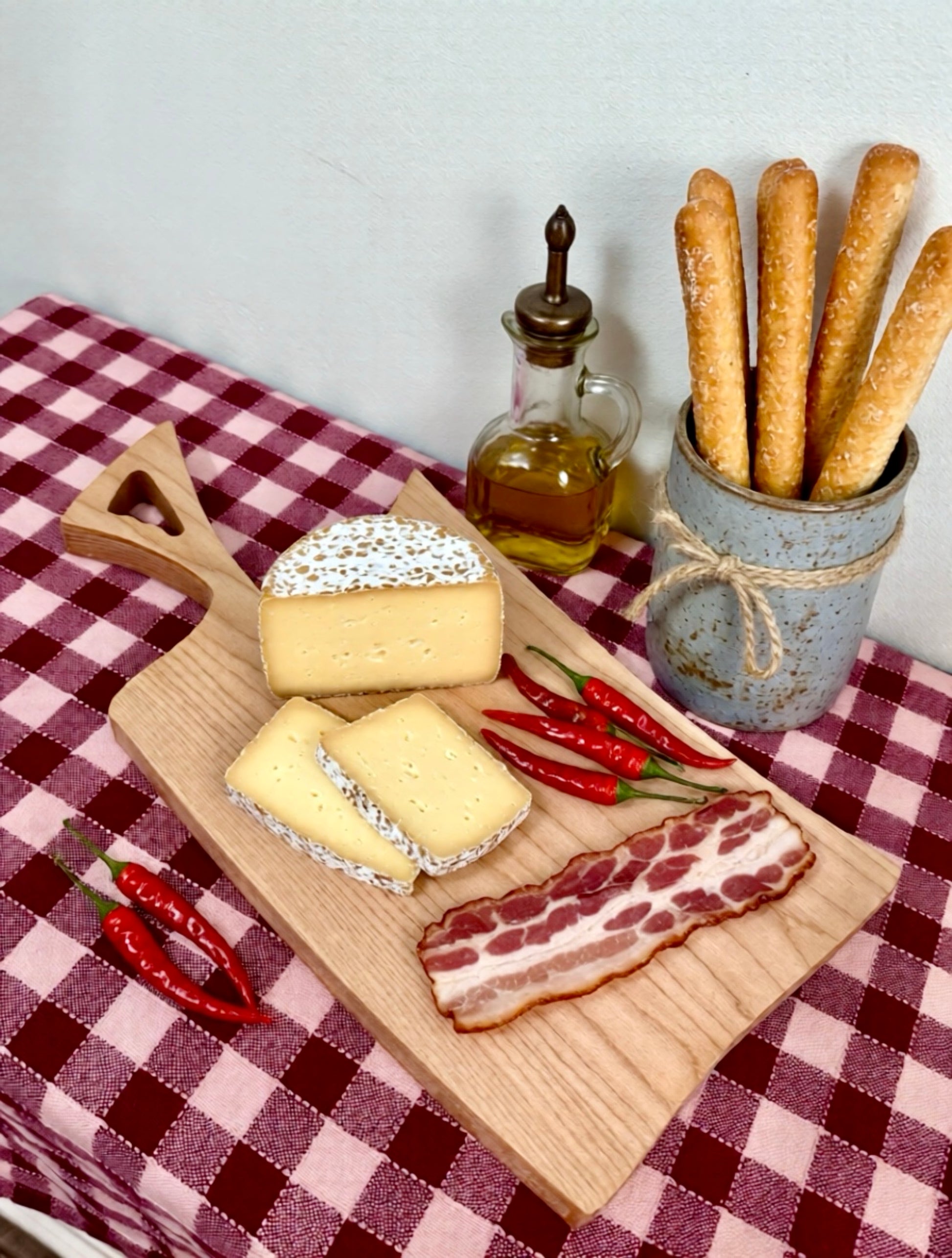 Tagliere realizzato a mano nel nostro laboratorio in legno d’acero canadese, perfetto per servire salumi, formaggi, antipasti o piccoli aperitivi con un tocco rustico ed elegante.