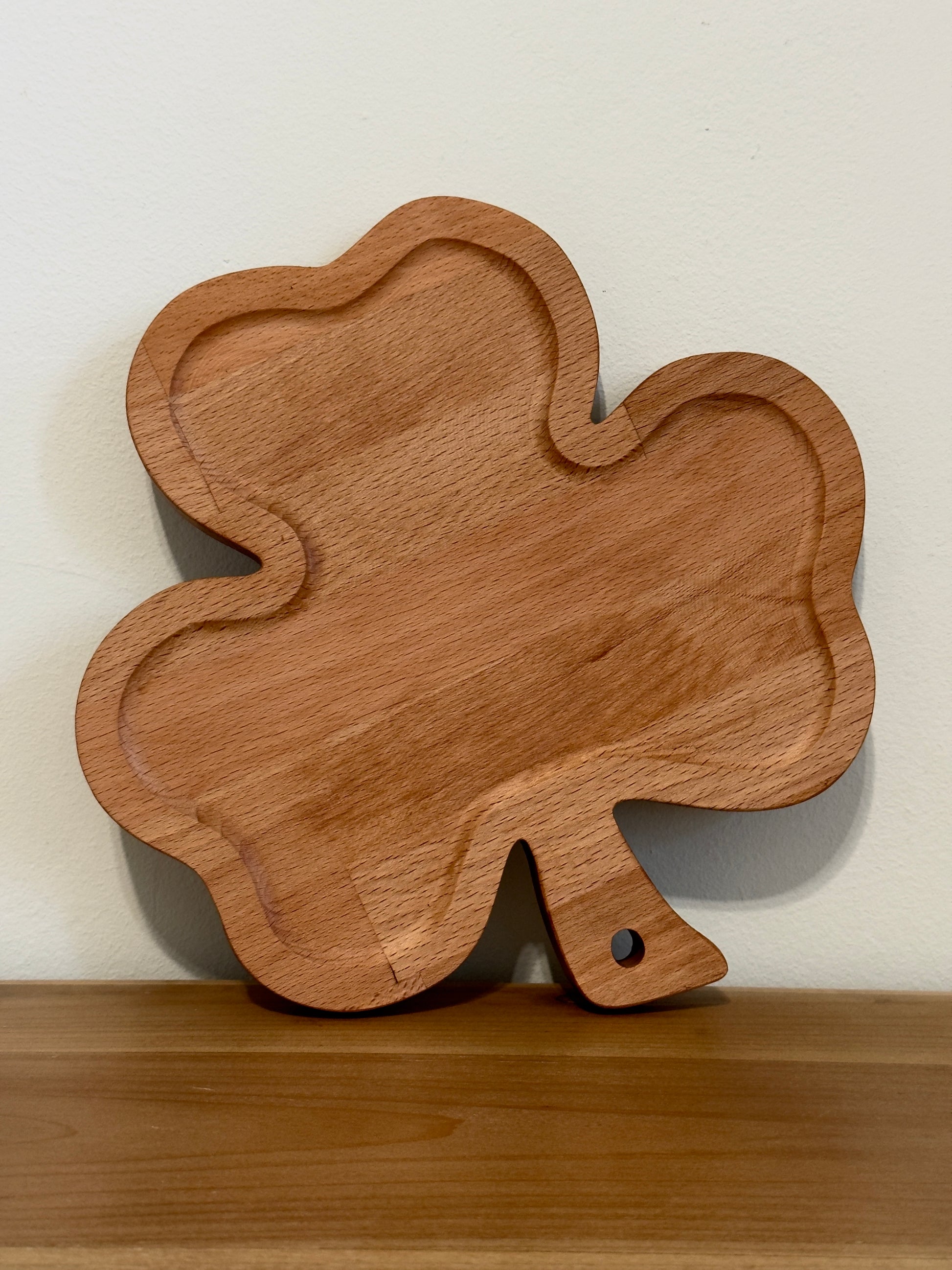 Tagliere artigianale a forma di trifoglio, realizzato in legno massello e rifinito a mano per valorizzare ogni venatura naturale. La sua forma originale e armoniosa lo rende perfetto per servire sia dolci che salati: biscotti, cioccolato, formaggi, affettati o piccoli stuzzichini da aperitivo.