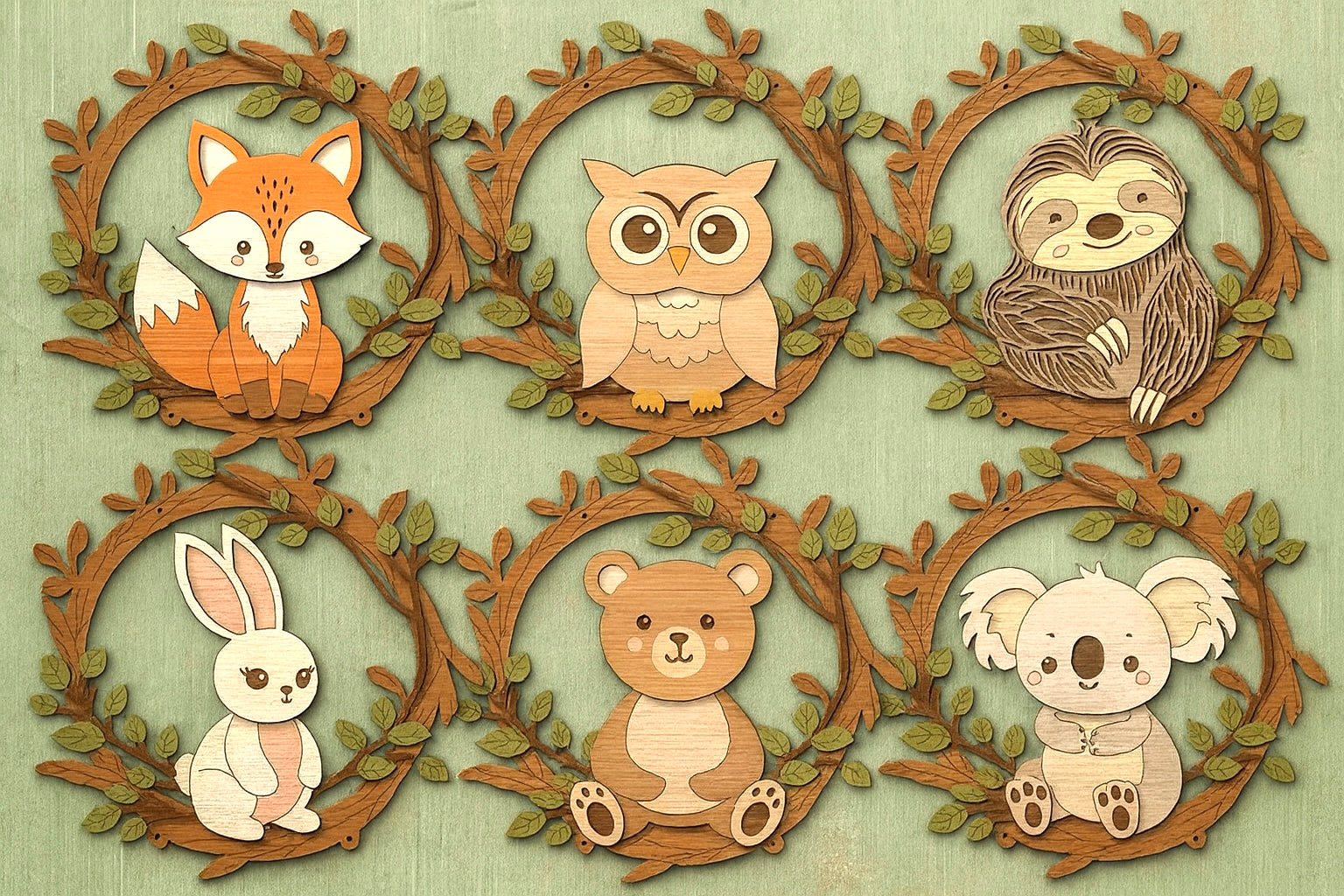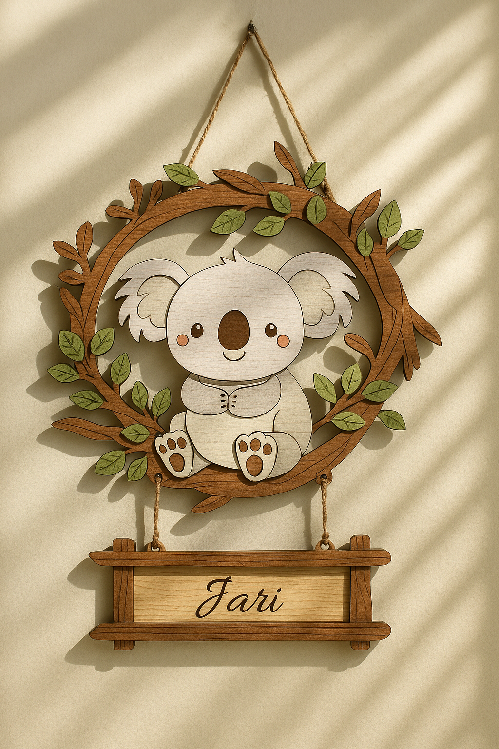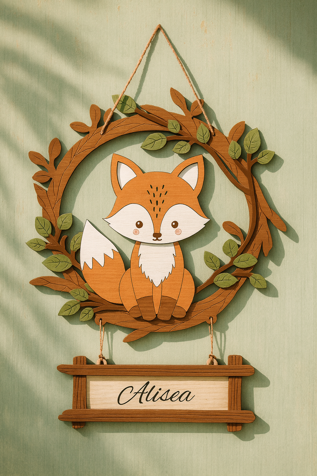 Dolcissime targhe decorative realizzate in legno, perfette per personalizzare la cameretta dei bambini o come idea regalo unica e speciale. Ogni targa è composta da una cornice circolare intrecciata con rami e foglie, al cui interno prende vita un tenero animaletto: volpe, koala, gufo, bradipo, coniglietto o orsetto.