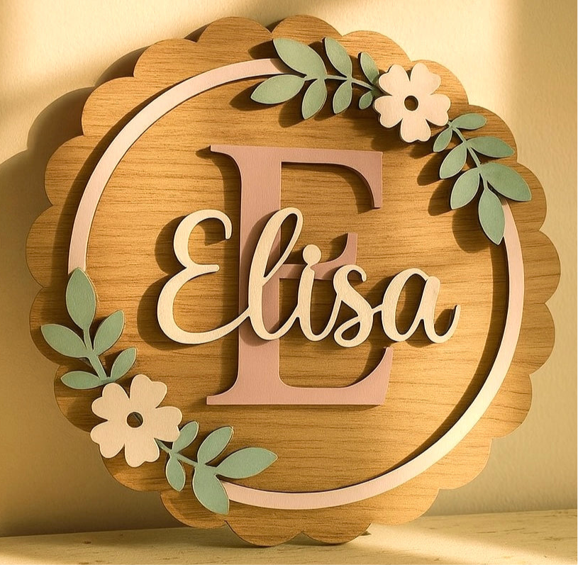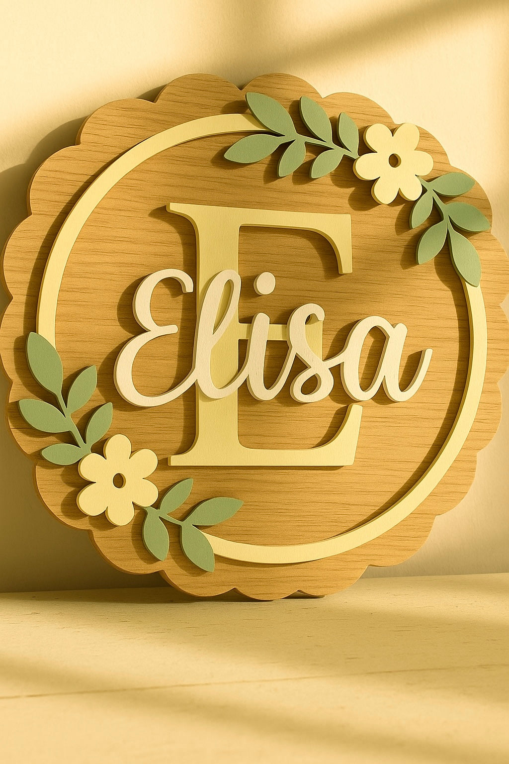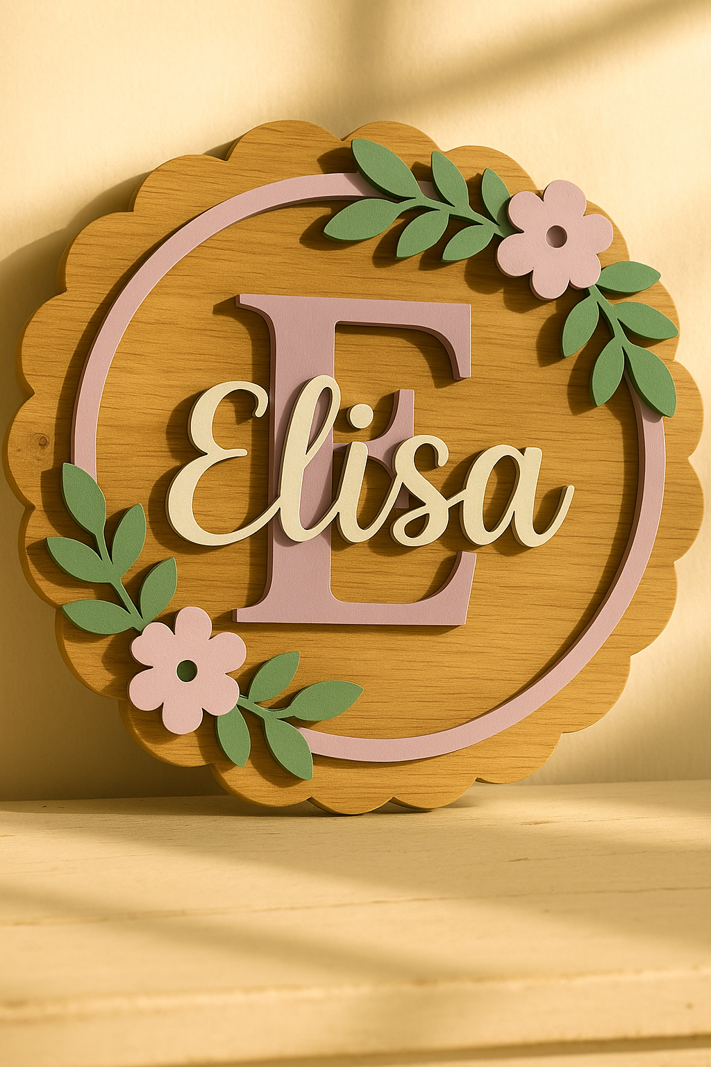 La targa è caratterizzata da una base rotonda con bordo sagomato, su cui spiccano una lettera grande e il nome sovrapposto in corsivo, creando un effetto tridimensionale, armonioso e delicato tra fiori applicati con foglioline che donano un tocco dolce.