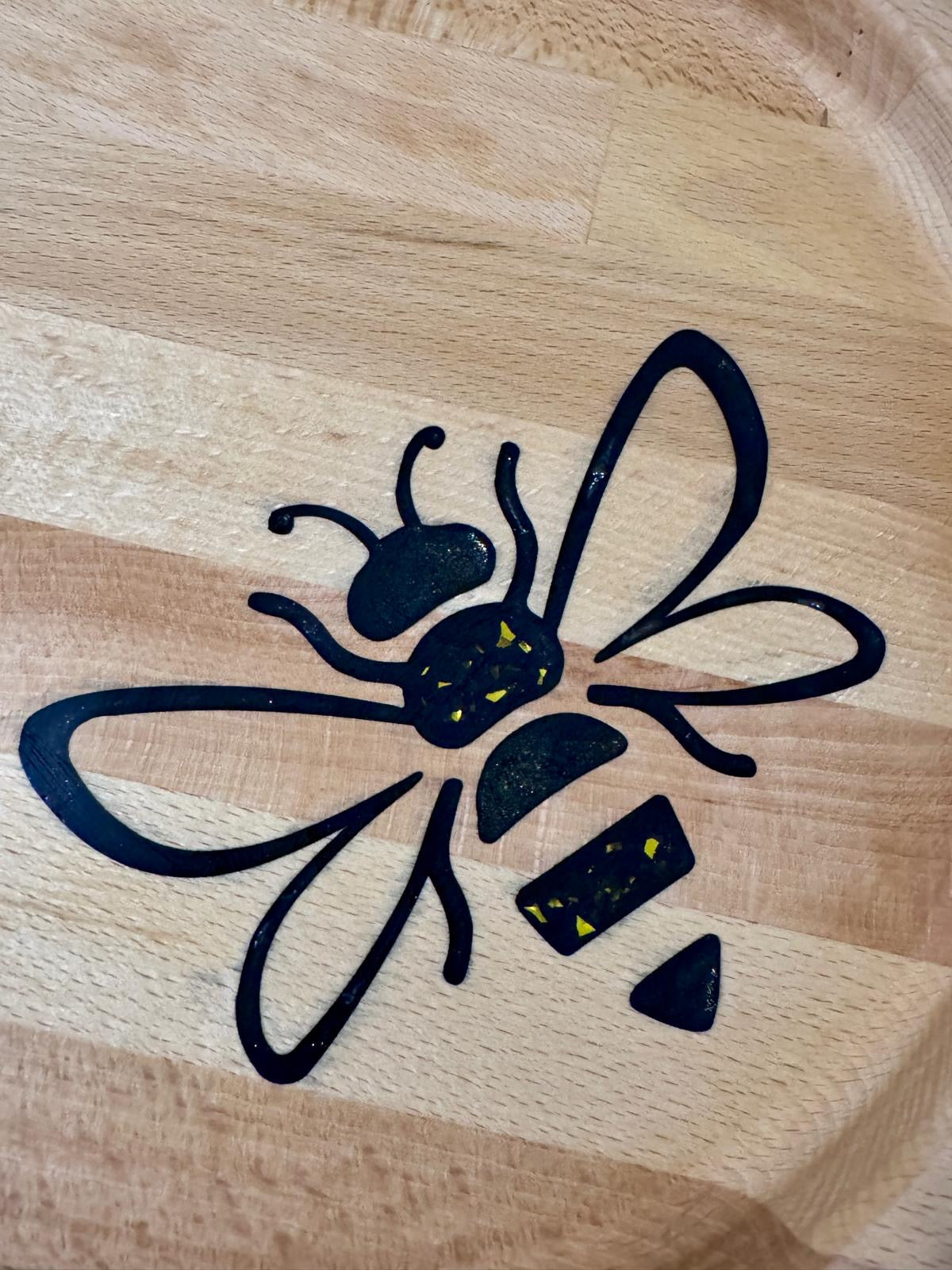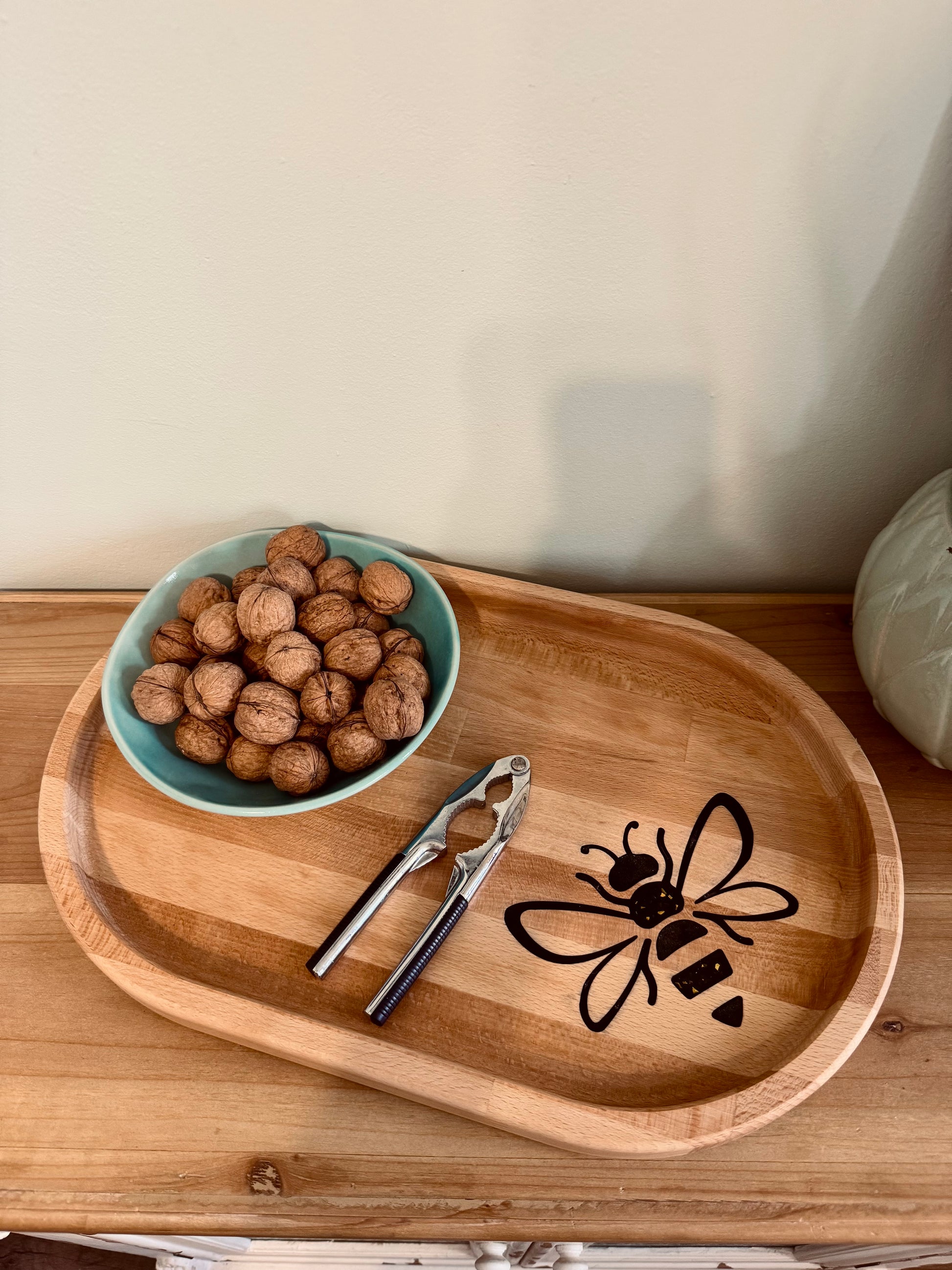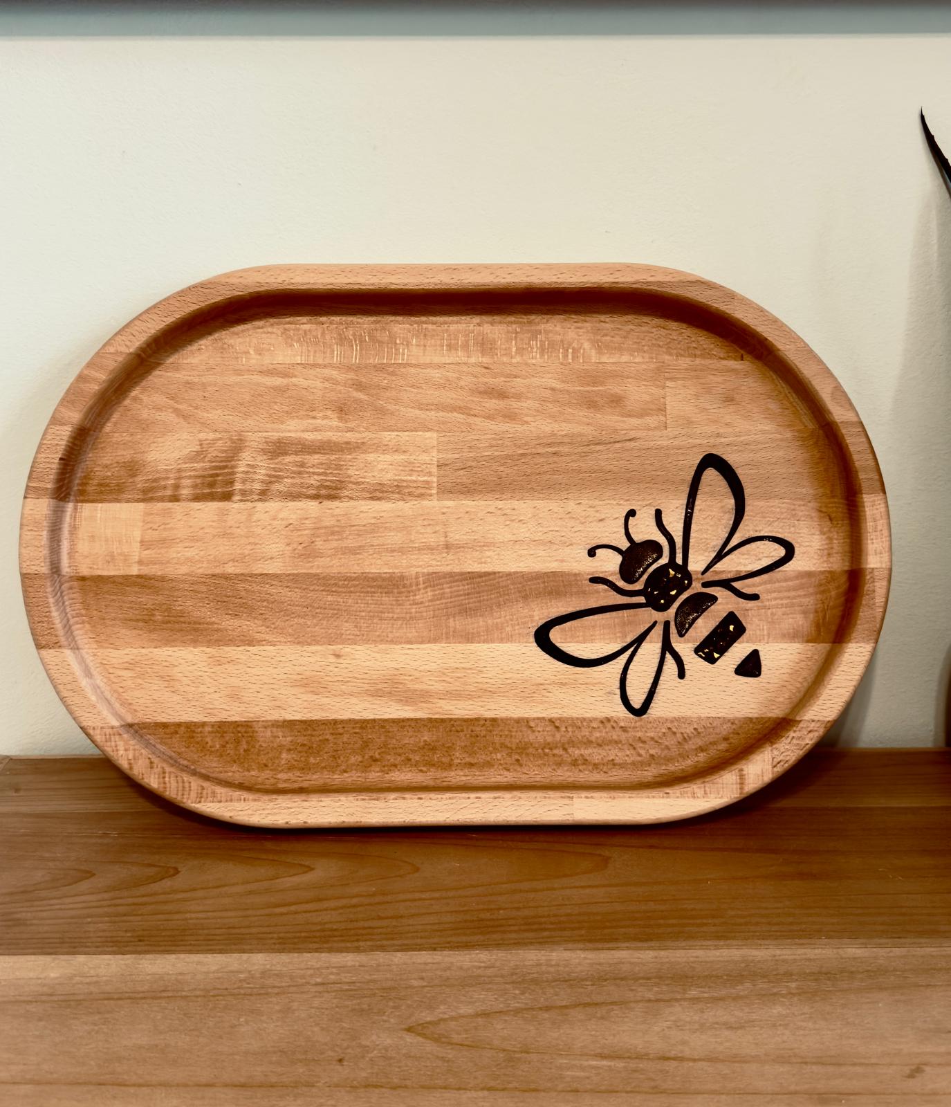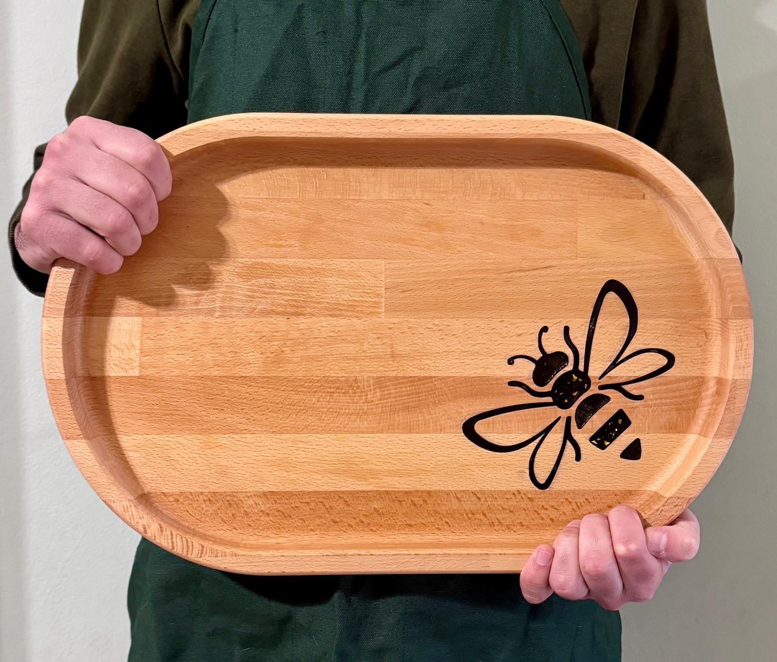 Elegante vassoio artigianale in legno di faggio, resistente e naturale, decorato con una raffinata incisione a forma di ape stilizzata rifinita in resina.