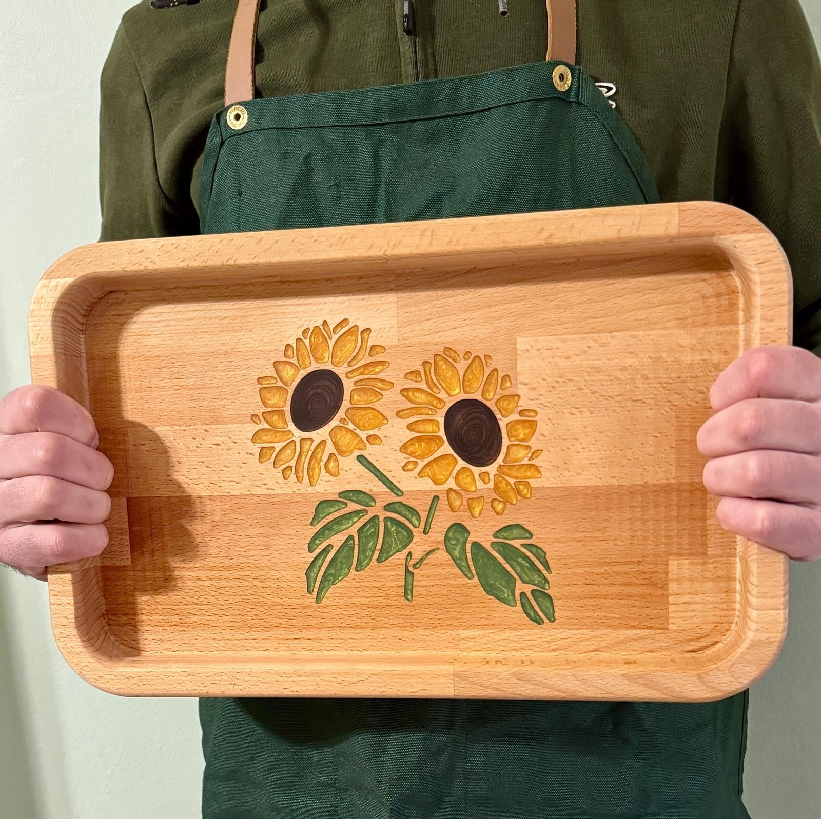 Elegante vassoio artigianale in legno di faggio, resistente e naturale, impreziosito da una raffinata incisione raffigurante due girasoli stilizzati rifiniti in resina.